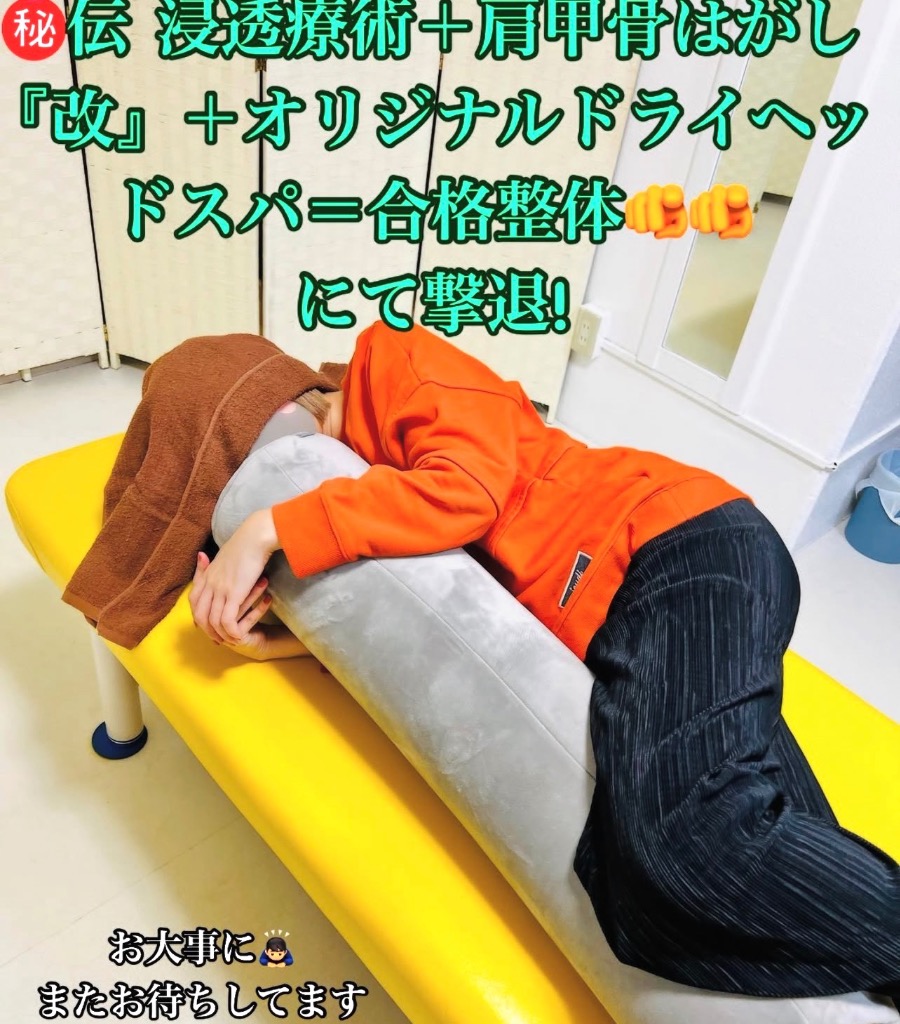✅酷い肩こり首こりによる頭痛の方には浸透療術とのミックス整体オリジナルドライヘッドスパ+肩甲骨はがし改を融合した㊙️奥技【合格整体】をご利用ください。