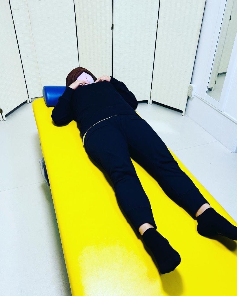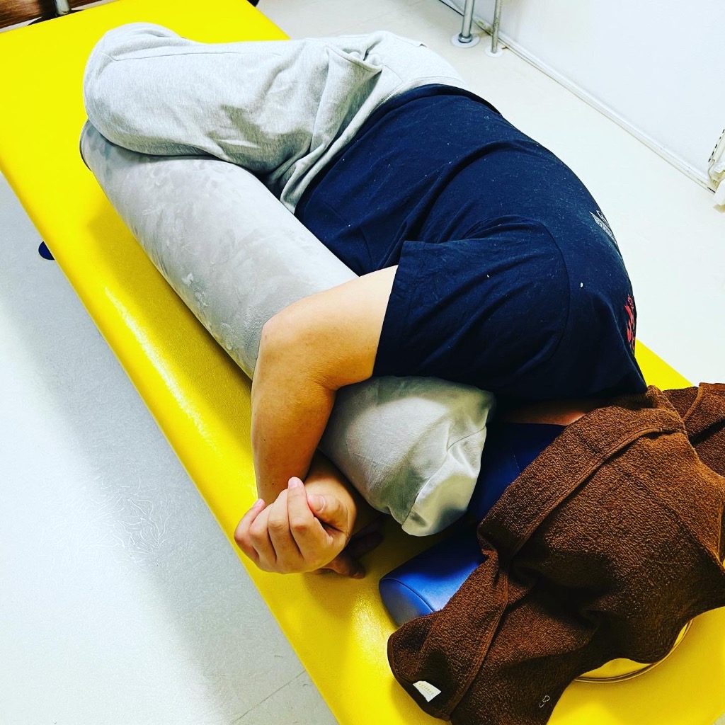 前半うつ伏せスタート➡️秘技横向き整体でのお気に入り抱き枕メーテルの出番でリラックス脱力時代😇仕上げに下肢のアライメント調整でfinish🙇🏻♂️