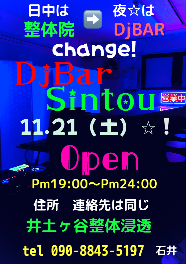 井土ヶ谷整体浸透第二店舗になりますDj Bar Sintouが予定しておりました11.21土曜日にOpenします。井土ヶ谷整体浸透と同様にご来店のお客様にはアルコール消毒 検温器 寒いですが換気のご協力のほど宜しくお願いします。